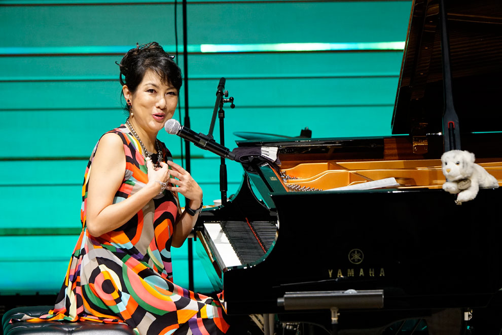 1日目は、ジャズピアニストの国府弘子氏が登場。『きらきらぼし』をジャズやスウィング、ボサノヴァ、サンバなど様々なスタイルのアレンジで演奏したり、客席から4名の子どもにそれぞれ好きな音を1音選んでもらい、4音をつなげた即興演奏を披露。また、オーケストラとの演奏で有名なガーシュインの『ラプソディ・イン・ブルー』を、ピアノ1台による迫力ある演奏で披露しました。この日のテーマ「~音のおしゃべり、音のお料理~」らしい軽快なトークとピアノ演奏による楽しいひと時となりました。