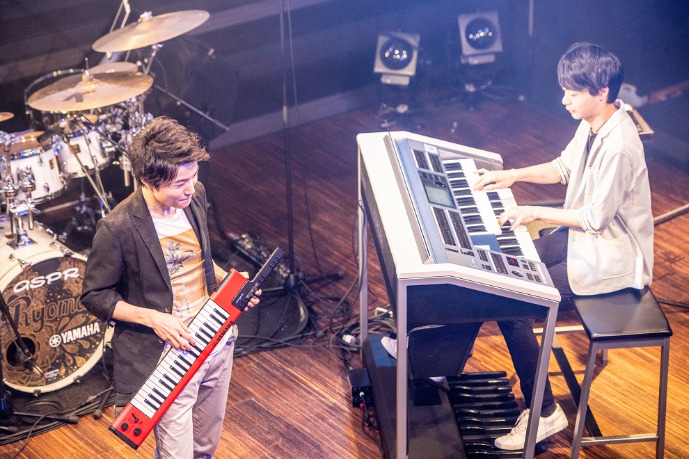 川上さんがYECで1位を獲得した際の演奏曲『Overcome』は、サックス篠嶋さんとのデュオでプレイ。疾走感たっぷりのデジタルフュージョン、濃厚なアドリブバトルも繰り広げられていきました。チック・コリアの『God a match?』は、ライブメンバーから「3人の匠」と呼ばれる、武本さん、寺島さん、ドラム多田さんの顔合わせ。武本さんのショルダーキーボードを操っての演奏は、より一層自由度を増して変化し続けていき大興奮。ラスト、全員での『SUN』で拍手が止まらないほどの熱狂となれば、もちろんアンコールも。みんなが知っている『Isn’t she lovely』も彼ら7人の手にかかると一味違ったアレンジに。バウンスするリズムと気心の知れた仲間同士でしか作ることができないアドリブが楽しい時間をめいっぱいまで盛り上げ、外の猛暑に負けない熱気に包まれて終演となりました。
