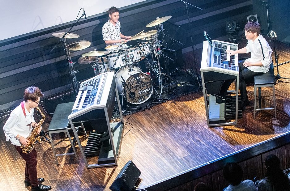 ヤマハエレクトーンコンクール最高位受賞コンビ、寺島怜志さん&川上天馬さんの「てらしまてんま」。フリーアナウンサー川口満里奈さん、エレクトーンデモンストレーター安達香織さんによる弾き語りデュオ「tina&tino」。そしてジャズピアニストとしても活躍中の武本和大さん、サックスの篠嶋祐希さん、ドラムの多田涼馬さんからなるジャズトリオ「武本&篠嶋&多田トリオ」。サックスの篠嶋さんも含めて幼い頃からヤマハ音楽教室で学んできた同世代の仲間たちが、「せっかくエレクトーン誕生60周年の年にユニット活動を始めるのだから、エレクトーンで学んできたことへの感謝も込めて何か面白いことをやりたい」と企画したのが、この「SHOWCASE 3units from Play on Passion」。2019年8月2日(金)、ヤマハ銀座スタジオ(東京都中央区)は豪華な3ユニットの共演を見逃すまいと、多くの観客か詰めかけ早々に満席。ワクワクの高揚感が会場いっぱいに広がりました。
